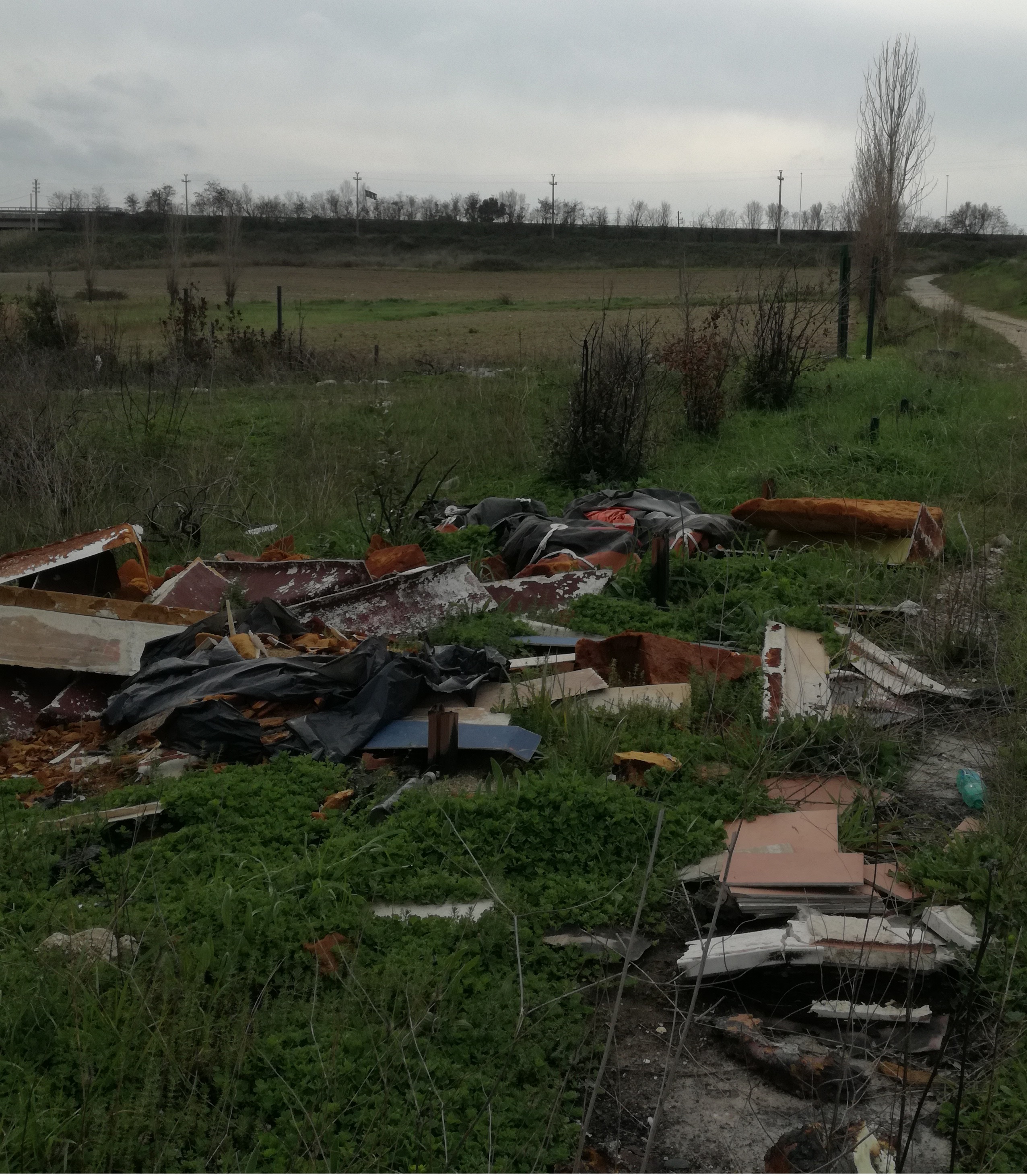 Una discarica abusiva a cielo aperto che costituisce una parte rilevante e aberrante del paesaggio e in cui spicca la presenza di rifiuti pericolosi, costituiti da manufatti in eternit, e di RAAE, rifiuti da apparecchiature elettriche ed elettroniche, con il loro possibile carico di sostanze nocive per l'ambiente e la salute, come i metalli pesanti che rappresentano un potenziale pericolo ambientale, che Legambiente Taranto ha immediatamente segnalato al Comando della Polizia Municipale e di cui ha richiesto la rimozione immediata.
