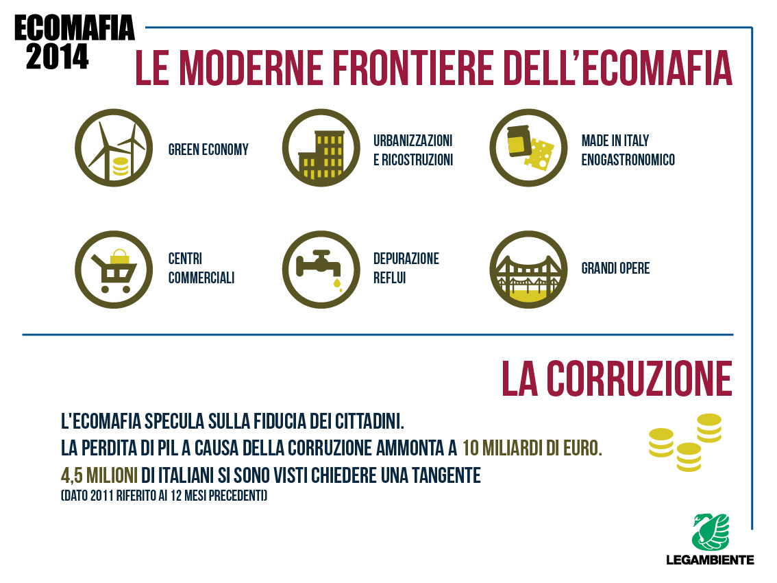 "Ecomafia 2014 - ha dichiarato la direttrice nazionale di Legambiente Rossella Muroni – evidenzia un nuovo aspetto delle attività degli ecocriminali che si muovono con strategie sempre più sofisticate camuffate di legalità che si espandono verso nuovi settori. Sul fronte della corruzione è necessaria una risposta urgente perché è proprio l'area grigia dei funzionari pubblici corrotti che arricchisce e rende ancor più potente l'ecomafia. Nelle banche straniere transitano soldi accumulati trafficando rifiuti, prodotti alimentari contraffatti e opere d'arte rubate. Diminuisce leggermente il numero dei reati che diventano però più gravi, invasivi e pericolosi. La corruzione, la complicità di quella che abbiamo chiamato 'area grigia' dei funzionari pubblici consenzienti, amplifica il fenomeno che riguarda tutta l'Italia e si allarga all'Europa, danneggiando pesantemente l'economia legale, consumandone spazi e risorse e condizionando profondamente alcuni settori strategici, come quello delle rinnovabili ad esempio, dove le organizzazioni criminali investono sempre di più approfittando dei prestiti e degli aiuti europei che gli permettono di ripulire i profitti illeciti attraverso attività economiche legali".