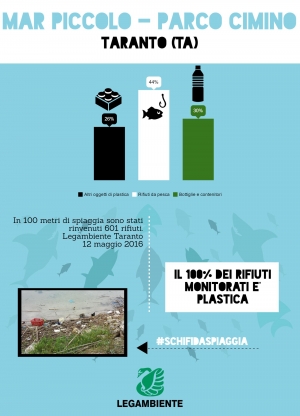 Alta la percentuale dei rifiuti da pesca (il 44%) per la spiaggia sul Mar Piccolo a Taranto, nei pressi del Parco Cimino, caratterizzata dalla quantità più elevata della categoria "reti e pezzi di rete". Per le sue particolari condizioni questa è l'unica spiaggia dell'indagine in cui la totalità dei rifiuti rinvenuti è costituito da materiale plastico al 100%. In tutto sono stati rinvenuti 601 rifiuti.