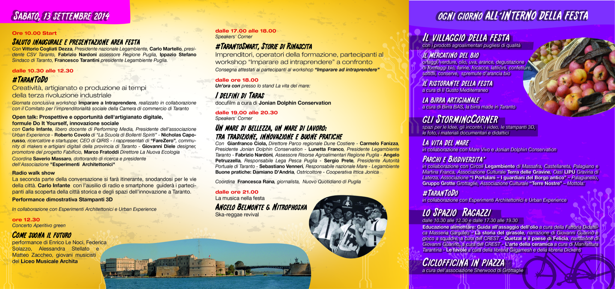 Radio walk show: La seconda parte della conversazione si farà itinerante, snodandosi per le vie della città. Carlo Infante con l'ausilio di radio e smartphone guiderà i partecipanti alla scoperta della città storica e degli spazi dell'innovazione a Taranto.